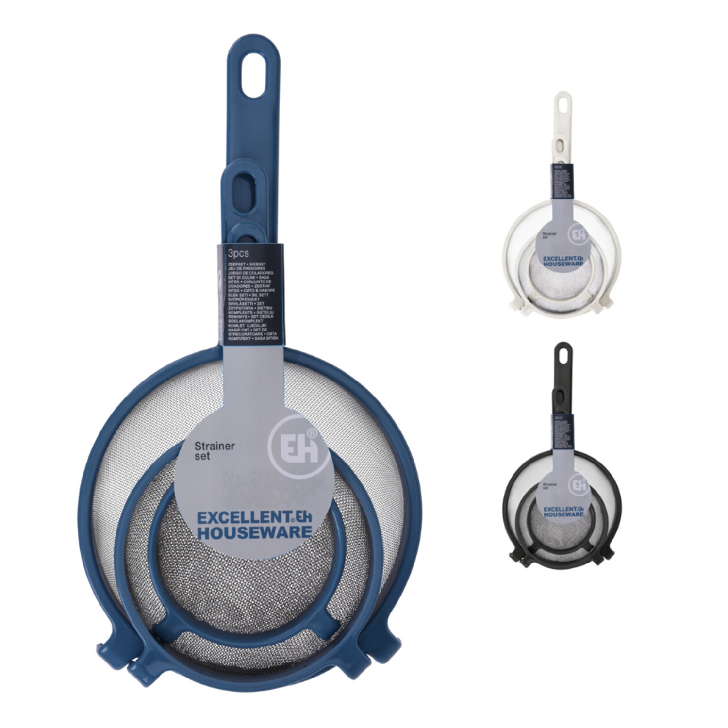 Excellent Houseware zeefset kunststof 3-delig bestaat uit 3 zeven in verschillende formaten: 17,5 cm, 13,5 cm en 10 cm. Verkrijgbaar in 3 kleuren: wit, blauw, zwart. Vooraf is niet te bepalen welke kleur je ontvangt.