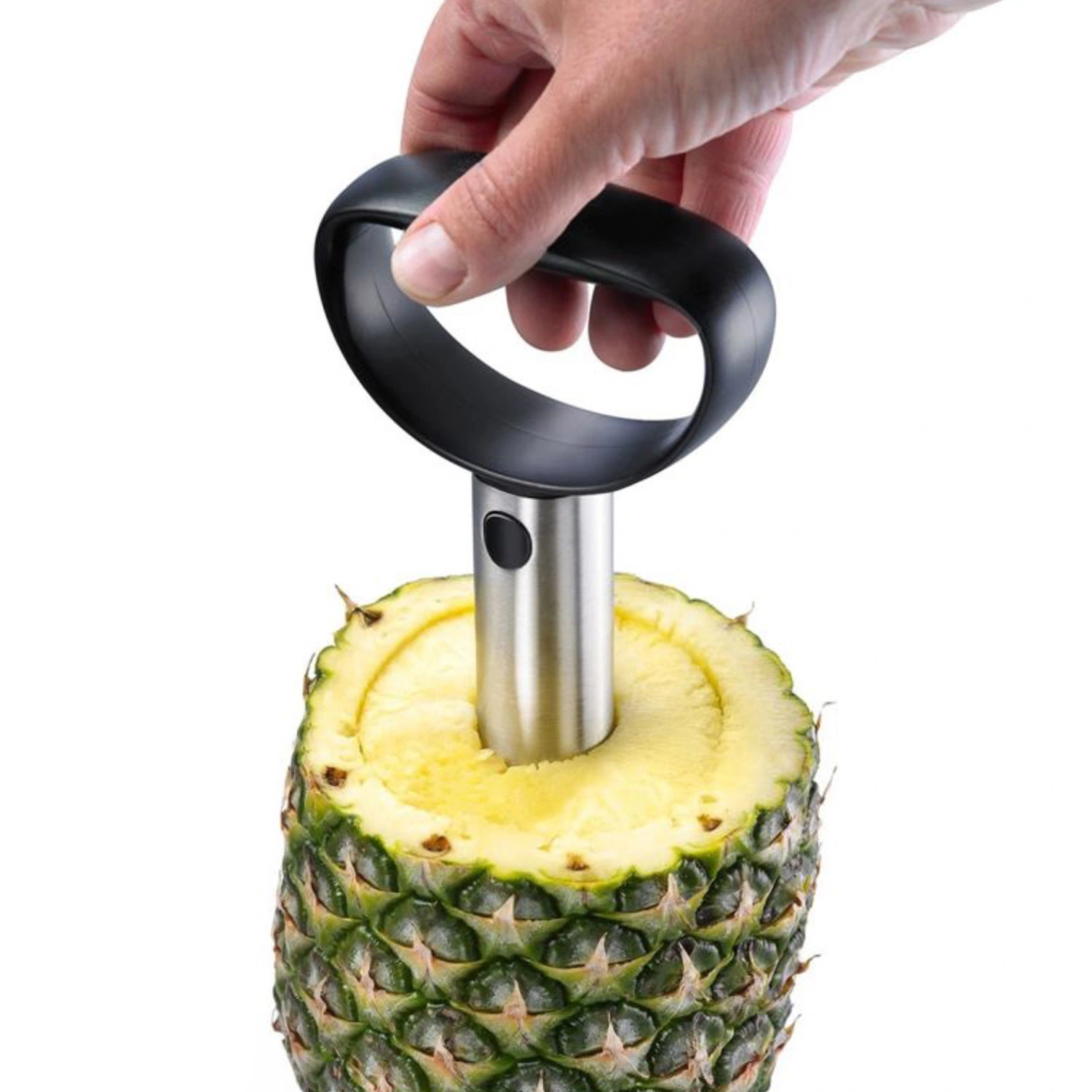De praktische ananassnijder ontpit, schilt en snijdt hele ananasvruchten voor fijne fruitsalades, schotels, desserts en muesli in slechts één handeling. Door de snijder in de ananas te draaien, snijdt u spiraalvormig in het vruchtvlees en ontkernt u tegelijkertijd de ananas. De scherpe, getande snijring van roestvrij staal zorgt ervoor dat de ananas gemakkelijk kan worden doorboord en uitgehold. De vers gesneden spiraal kan door er eenvoudig in te snijden omgevormd worden tot kant-en-klare plakjes. Voordeel: Omdat de schil intact blijft, gaat er geen sap verloren. De uitgeholde ananasschil kan als bakje worden gebruikt.